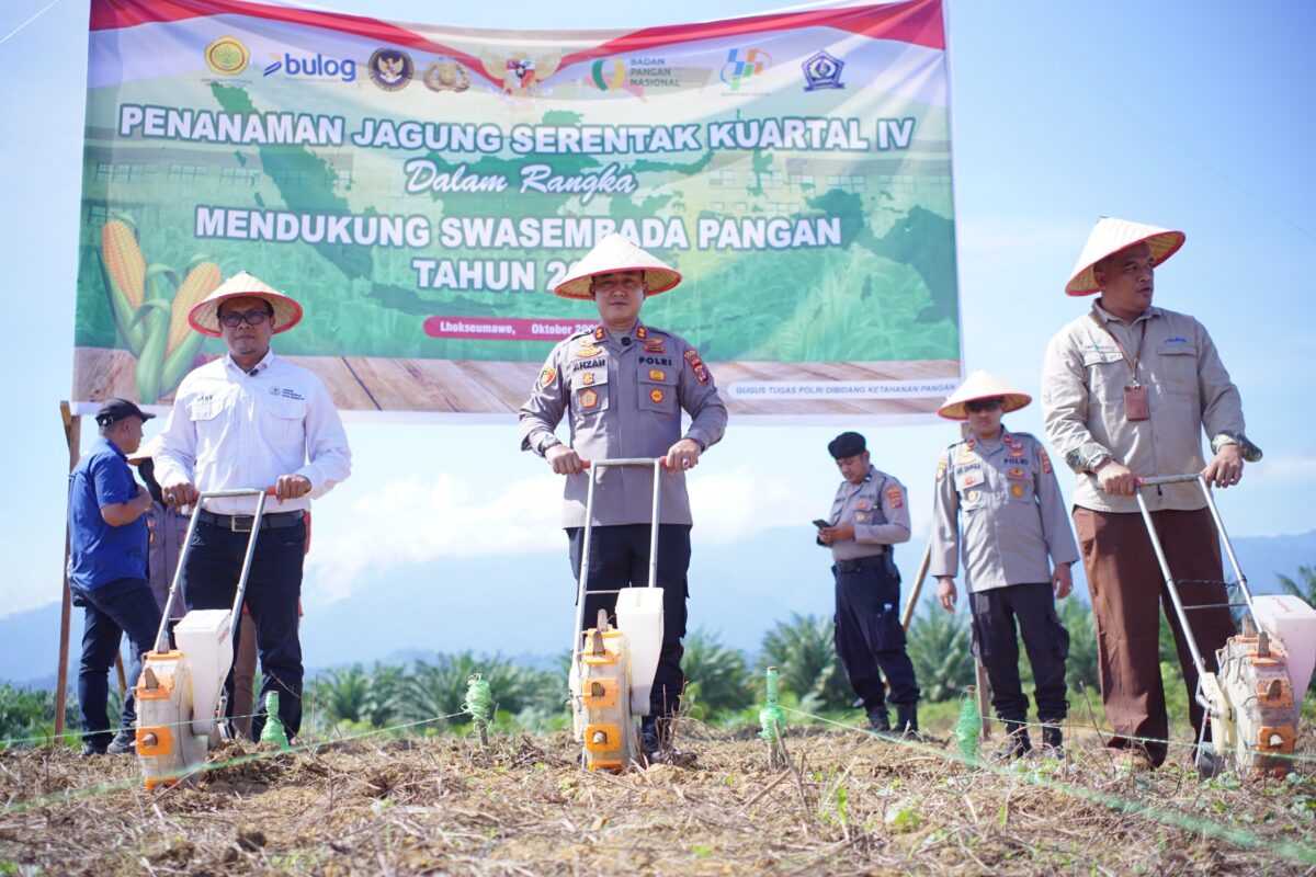 Lhokseumawe – Kapolres Lhokseumawe, AKBP Dr. Ahzan, S.H., S.I.K., M.S.M., M.H., memimpin kegiatan penanaman jagung serentak kuartal IV di lahan perkebunan sawit HGU milik PT Satya Agung, Desa Meunasah Dayah SPK, Kecamatan Simpang Keuramat, Kabupaten Aceh Utara, Rabu (8/10/2025). Kegiatan ini merupakan bagian dari komitmen Polri dalam mendukung program Swasembada Pangan Nasional Tahun 2025.