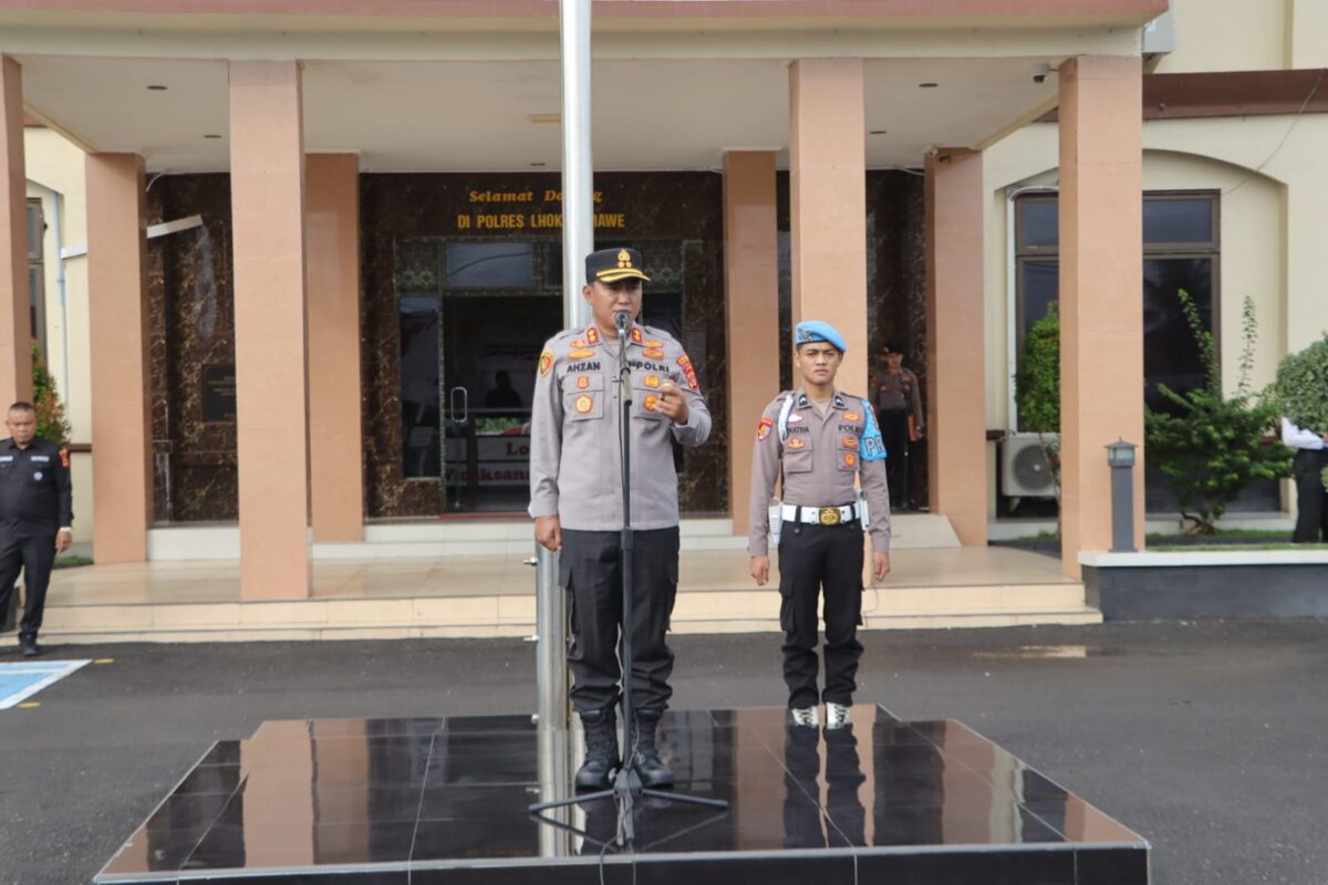 Lhokseumawe – Kapolres Lhokseumawe, AKBP Dr. Ahzan, S.H., S.I.K., M.S.M., M.H., memimpin apel pagi di halaman Mapolres Lhokseumawe, Senin (20/10/2025). Apel diikuti oleh para pejabat utama, perwira, dan seluruh personel Polres Lhokseumawe.