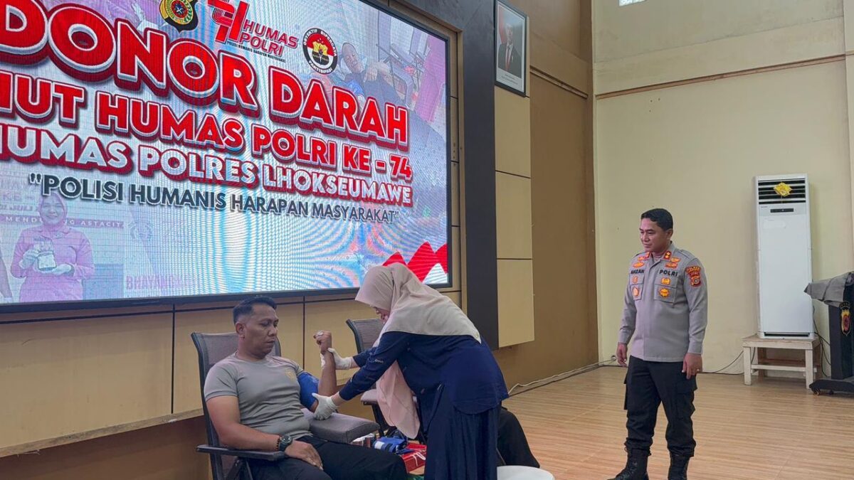 Lhokseumawe – Dalam rangka memperingati Hari Ulang Tahun (HUT) Humas Polri ke-74, Polres Lhokseumawe melaksanakan kegiatan donor darah di Aula Serbaguna Wira Satya, Rabu (22/10/2025) pagi. Kegiatan sosial ini diikuti oleh personel Polri, awak media, mahasiswa, dan masyarakat Kota Lhokseumawe. Sebanyak 63 kantong darah berhasil terkumpul yang nantinya disalurkan melalui Palang Merah Indonesia (PMI) untuk membantu pasien yang membutuhkan.