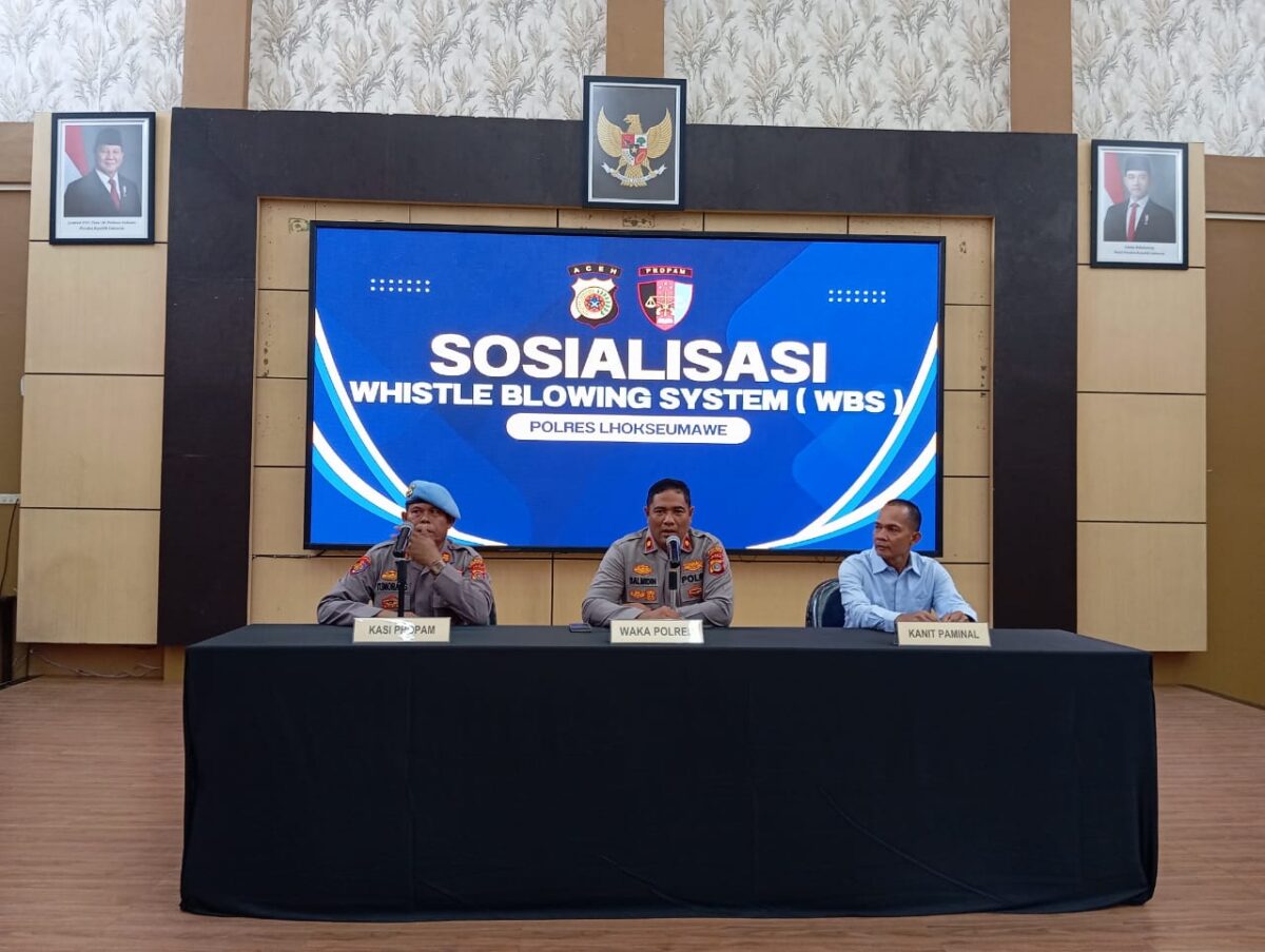 Dalam kesempatan itu, Wakapolres Lhokseumawe menjelaskan bahwa Whistle Blowing System merupakan mekanisme pelaporan yang dirancang untuk memfasilitasi anggota Polri maupun masyarakat dalam menyampaikan informasi terkait pelanggaran disiplin, kode etik, maupun tindak pidana yang melibatkan personel Polri. Ia menegaskan bahwa sistem ini bertujuan memperkuat budaya integritas serta meningkatkan kepercayaan publik terhadap institusi kepolisian.