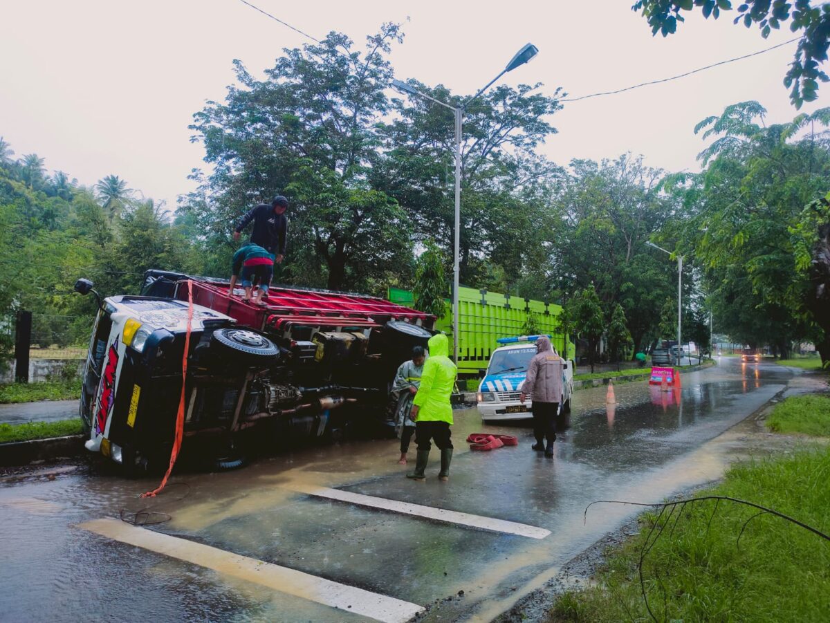 LHOKSEUMAWE – Satu unit truk enam roda (KR 6) terbalik di ruas Jalan Medan–Banda Aceh, tepatnya di depan PJB Desa Meuria Paloh, Kecamatan Muara Satu, Lhokseumawe, sekitar pukul 09.00 WIB, Selasa pagi (25/11/2025). Kondisi hujan deras, jalan licin, serta adanya lubang besar di badan jalan diduga menjadi penyebab kecelakaan tunggal tersebut. Personel Polres Lhokseumawe melalui Polsek Muara Satu bergerak cepat menuju lokasi untuk melakukan penanganan dan pengamanan arus lalu lintas.