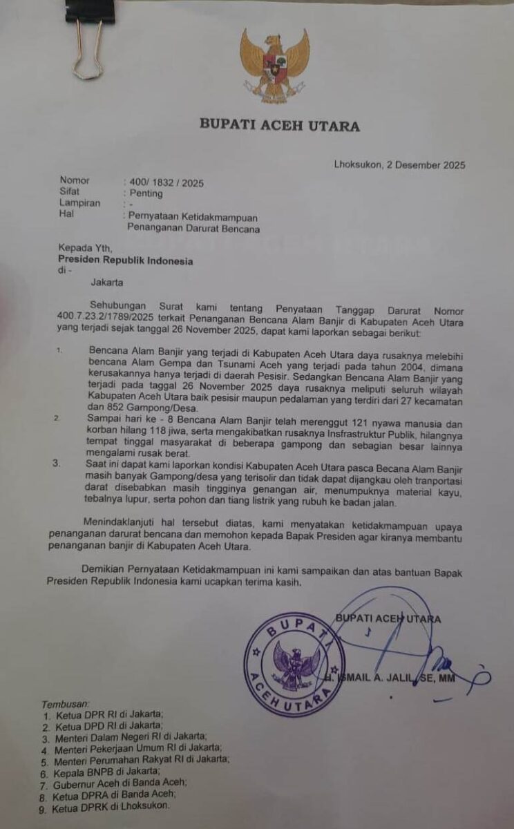 Lewat surat bernomor 400/1832/2025 yang ditujukan kepada Presiden Republik Indonesia, Bupati Aceh Utara, Ismail A. Jalil memohon bantuan pemerintah pusat karena kondisi di lapangan yang parah.