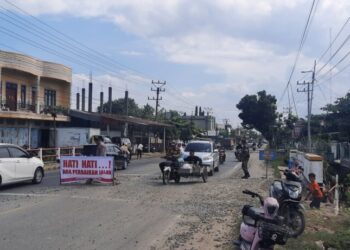 Aceh Utara — Kepolisian Sektor (Polsek) Syamtalira Bayu mengimbau seluruh pengguna jalan agar meningkatkan kewaspadaan saat melintasi jembatan rusak di jalur nasional tepatnya di depan UPTD Puskesmas Kecamatan Syamtalira Bayu, Kabupaten Aceh Utara, Rabu (24/12/2025).