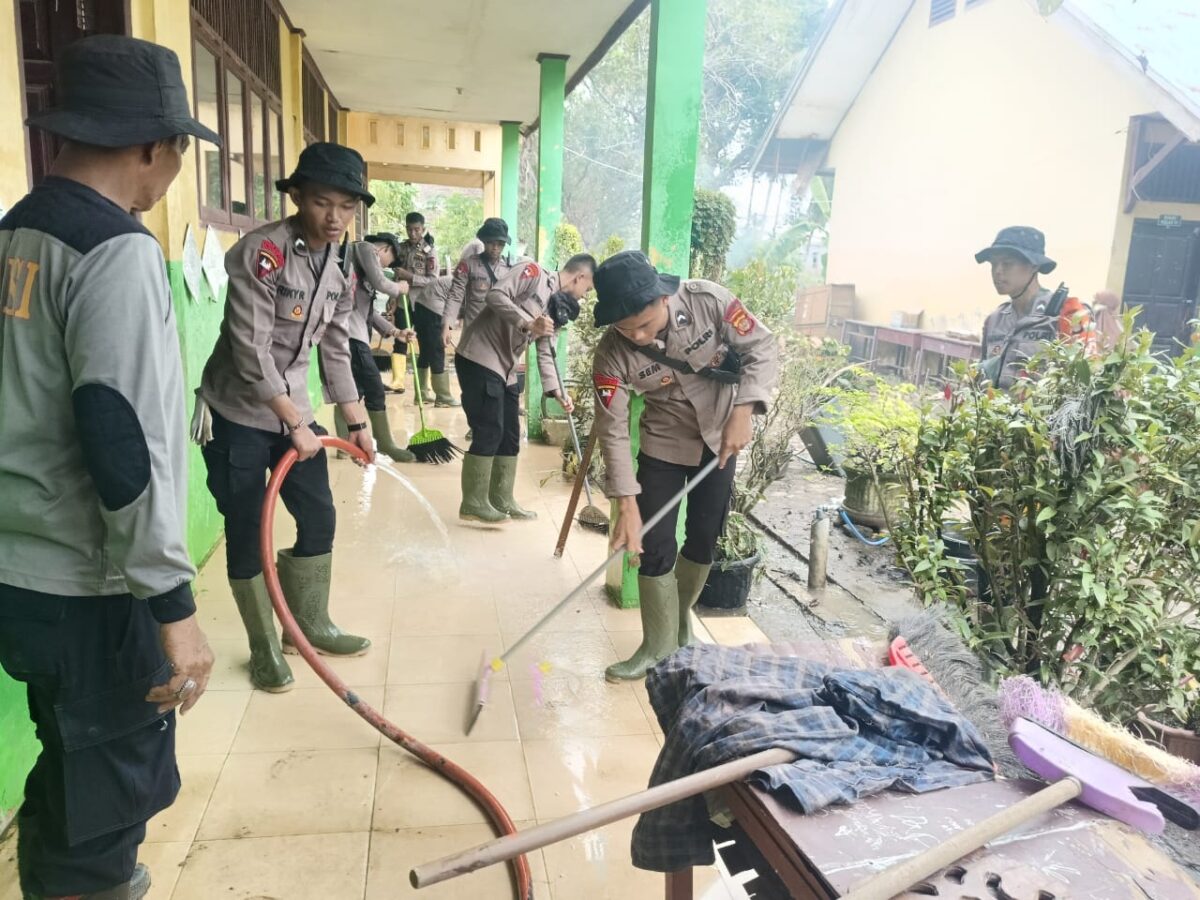 Polres Lhokseumawe Bersama Brimob Bersihkan SD Negeri 12 Dewantara Pascabanjir