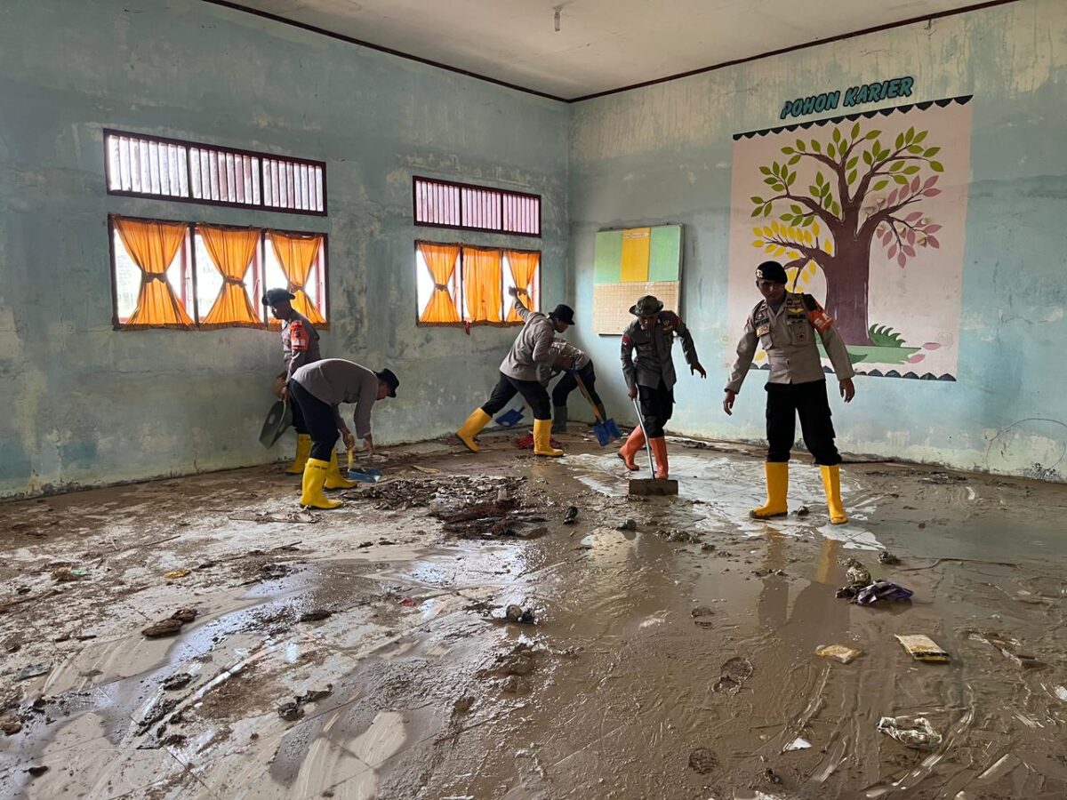 Polres Lhokseumawe Bersama Brimob Bersihkan SMP Negeri 2 Dewantara Pascabanjir