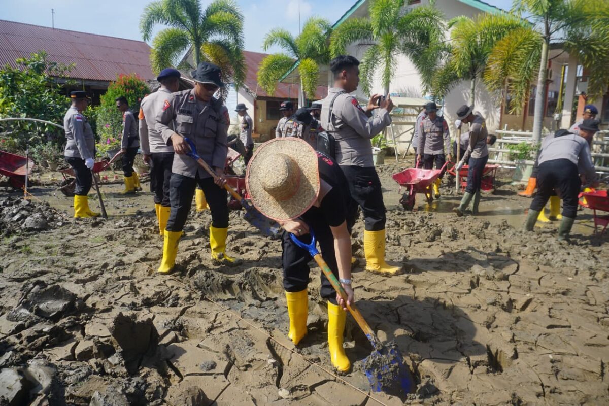 Puluhan personel Polres Lhokseumawe, Polsek Muara Batu, serta 60 personel Brimob Kaltim bergerak serempak. Ada yang menyapu, ada yang mengangkat lumpur, ada pula yang mengumpulkan buku-buku pelajaran yang telah rusak. Satu unit Water Canon dan mobil tangki air bekerja tanpa henti, menyiram sisa lumpur yang membandel di sudut-sudut sekolah.