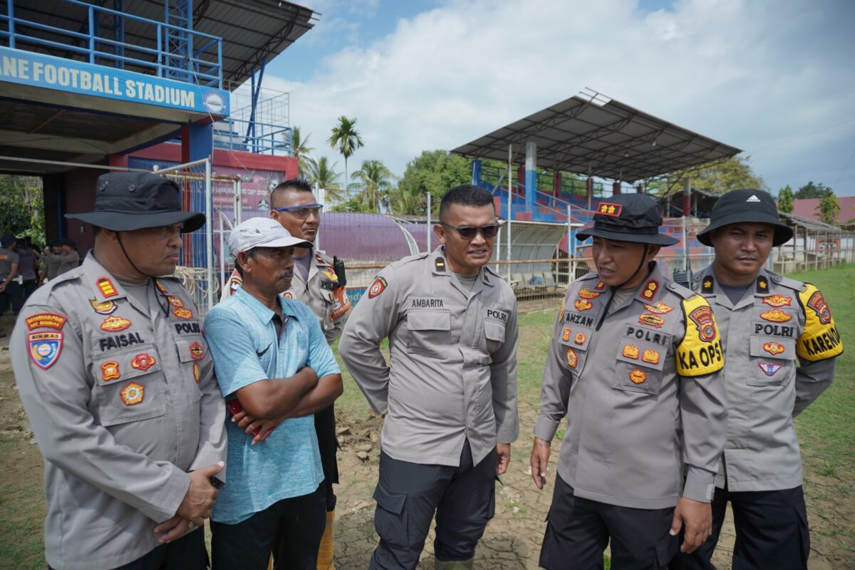 Kapolres Lhokseumawe Pimpin Gotong Royong Pembersihan Stadion Krueng Mane dan MIN 1 Muara Batu Pasca Banjir