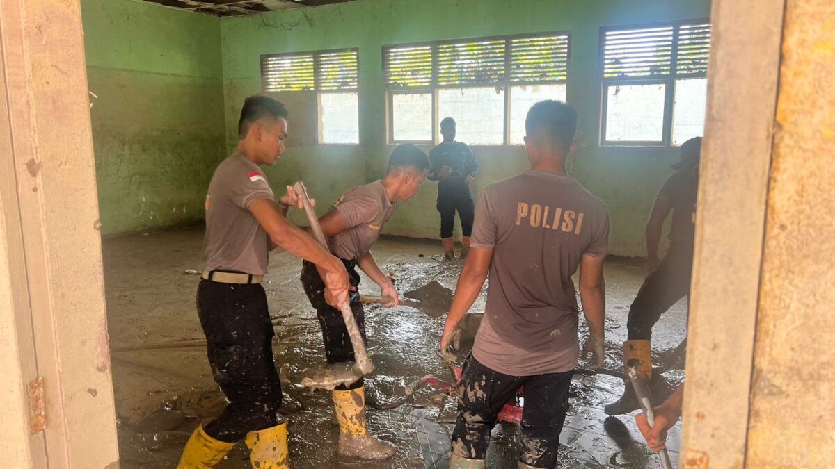 Polres Lhokseumawe dan Masyarakat Gotong Royong Pulihkan SMP Negeri 2 Muara Batu Pasca Banjir