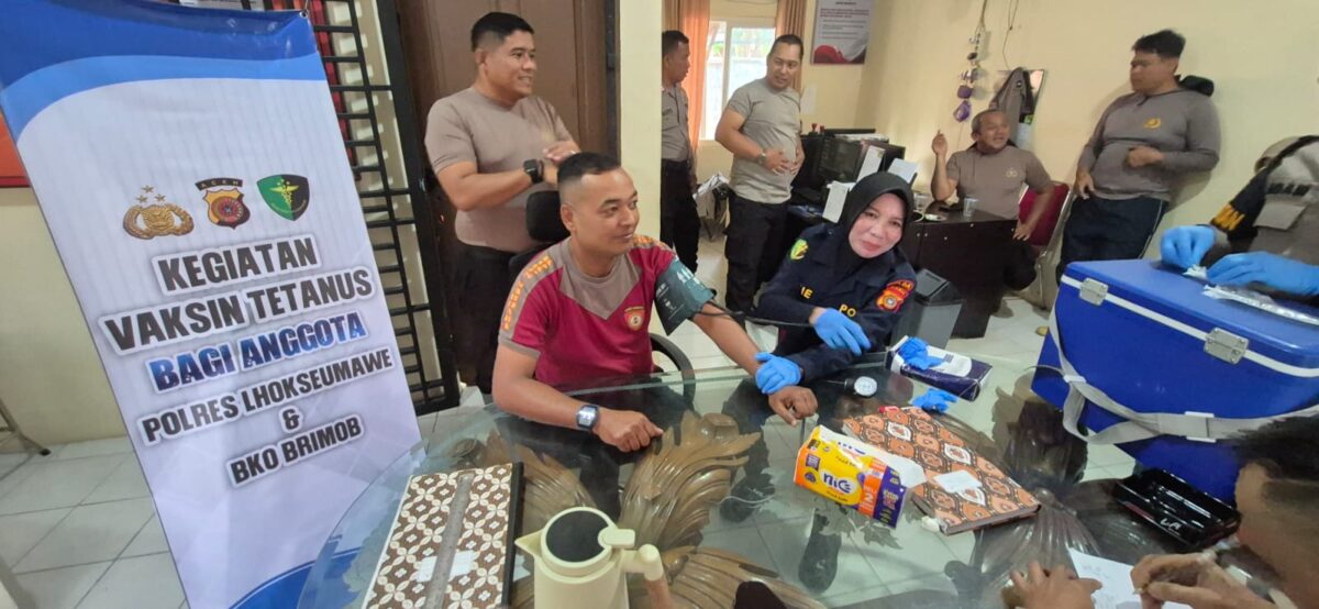 LHOKSEUMAWE – Seksi Kedokteran dan Kesehatan (Sidokkes) Polres Lhokseumawe melaksanakan kegiatan bakti kesehatan (baktikes) berupa pemberian vaksin tetanus dan pembagian vitamin kepada personel Polres Lhokseumawe dan personel BKO Brimob, Kamis (29/1/2026).