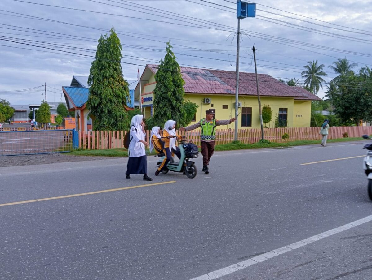 Lhokseumawe – Personel Polsek Blang Mangat melaksanakan kegiatan Strong Point pagi berupa pengamanan dan pengaturan arus lalu lintas di Jalan Raya Medan–Banda Aceh, tepatnya di Desa Ule Blang Mane, Kecamatan Blang Mangat, Kota Lhokseumawe, Senin (9/2/2026) pagi.