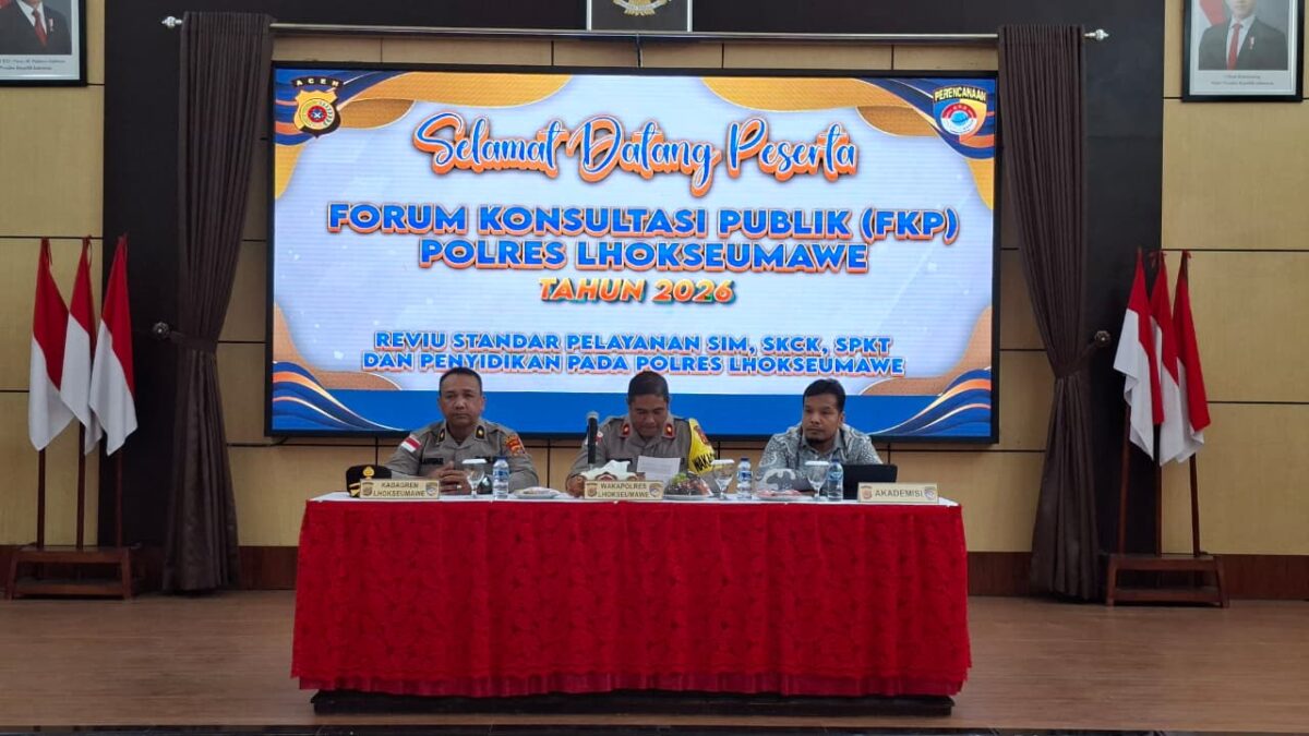 Lhokseumawe – Polres Lhokseumawe menggelar Forum Konsultasi Publik (FKP) Tahun 2026 di Gedung Serbaguna Wira Satya Mapolres Lhokseumawe, Jumat (13/2/2026) pagi. Kegiatan ini menjadi wadah dialog terbuka antara Polri dan masyarakat dalam rangka meningkatkan kualitas pelayanan publik di wilayah hukum Polres Lhokseumawe.