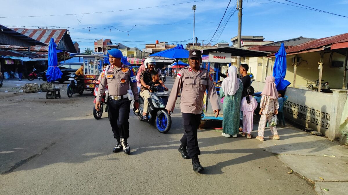 LHOKSEUMAWE – Dalam rangka mengantisipasi terjadinya gangguan keamanan dan ketertiban masyarakat (guantibmas) menjelang waktu berbuka puasa, personel Polsek Muara Satu, Polres Lhokseumawe, melaksanakan patroli pasar di kawasan Pasar Batuphat Timur, Senin (23/2/2026) sore.