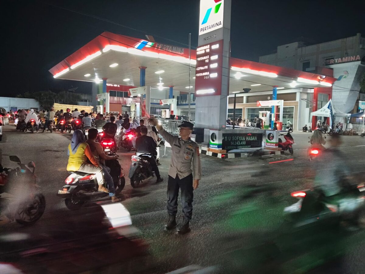Lhokseumawe – Polres Lhokseumawe mengerahkan sejumlah personel untuk melakukan pengamanan serta pengaturan lalu lintas di sejumlah Stasiun Pengisian Bahan Bakar Umum (SPBU) yang berada di wilayah hukum Polres Lhokseumawe, Kamis (5/3/2026) malam.