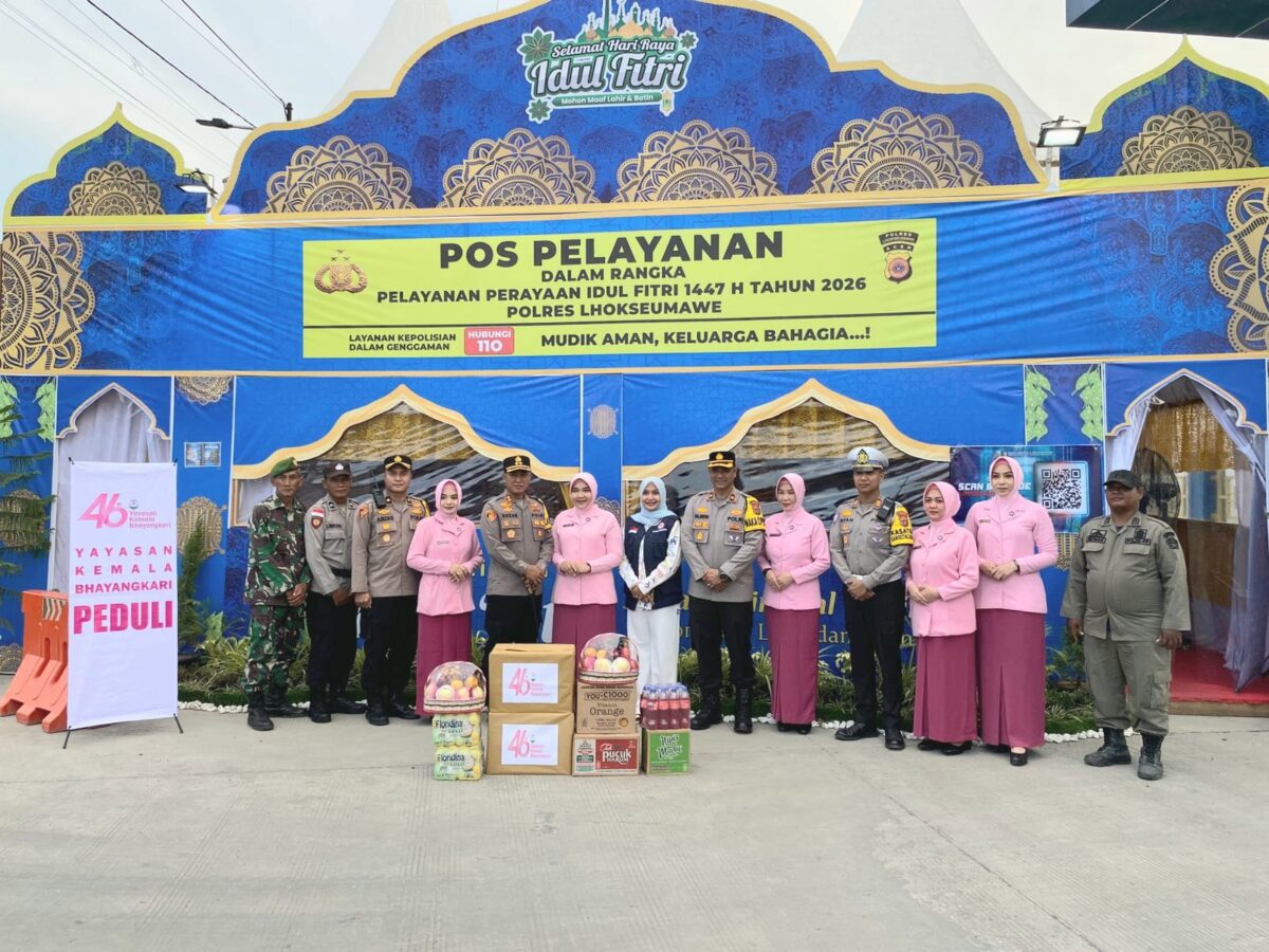 Lhokseumawe – Wujud kepedulian terhadap personel yang bertugas dalam pengamanan Hari Raya Idul Fitri 1447 H, Yayasan Kemala Bhayangkari Cabang Lhokseumawe menyalurkan bingkisan kepada petugas Pos Pelayanan Operasi Ketupat Seulawah 2026 Polres Lhokseumawe, Kamis sore (19/3/2026).
