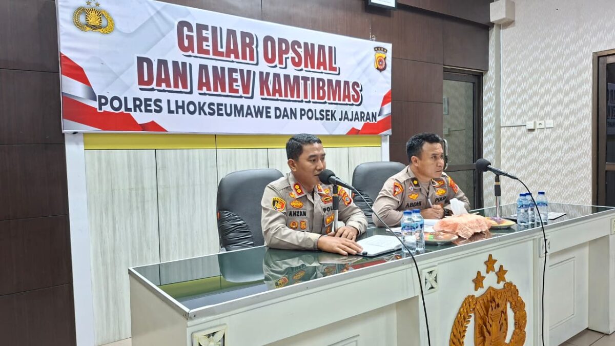 Lhokseumawe – Kapolres Lhokseumawe AKBP Dr. Ahzan., S.H., S.I.K., M.S.M., M.H memimpin langsung kegiatan Gelar Operasional yang diikuti oleh para Kabag, Kasat, Kasi serta Kapolsek jajaran di lingkungan Polres Lhokseumawe yang berlangsung di Aula Tribrata Polres Lhokseumawe, kamis pagi (2/4/2026).